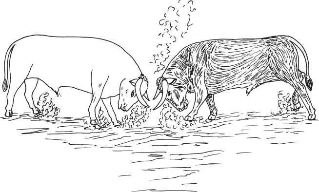 Два царя, оба верхом на славных конях, съехались вместе, чтобы сразиться. В то же время их дэвы-хранители – белый бык Калинги и черный бык Ассаки – принялись рыть копытами землю между двумя воинствами, готовясь броситься друг на друга. Два дэвы эти видны были только самим царям.