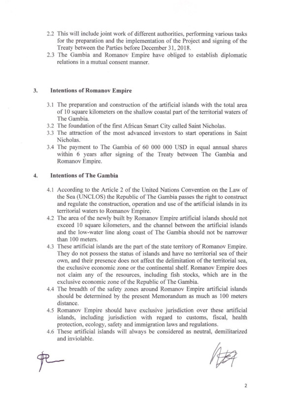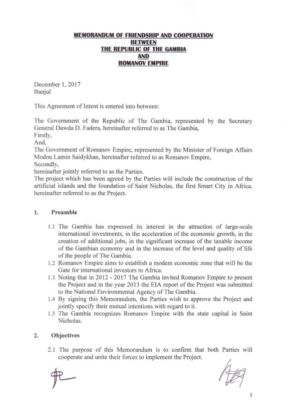 Пункт 1.2 меморандума предусматривал организацию Романовской империей свободной зоны – ворот для инвестиций в Гамбию. Пункт 1.5 фиксировал международно-правовое признание Гамбией Романовской империи как суверенного государства, а пункт 2.3 – организацию между нашими странами двусторонних дипломатических отношений! Пункт 3.1 выделял нам десять квадратных километров территориальных вод Гамбии для строительства искусственных островов, а пункт 3.4 предусматривал наш платеж в бюджет Гамбии в размере 60 миллионов долларов США. Пункт 4.6 навсегда закреплял нейтральный и демилитаризованный статус искусственных островов!