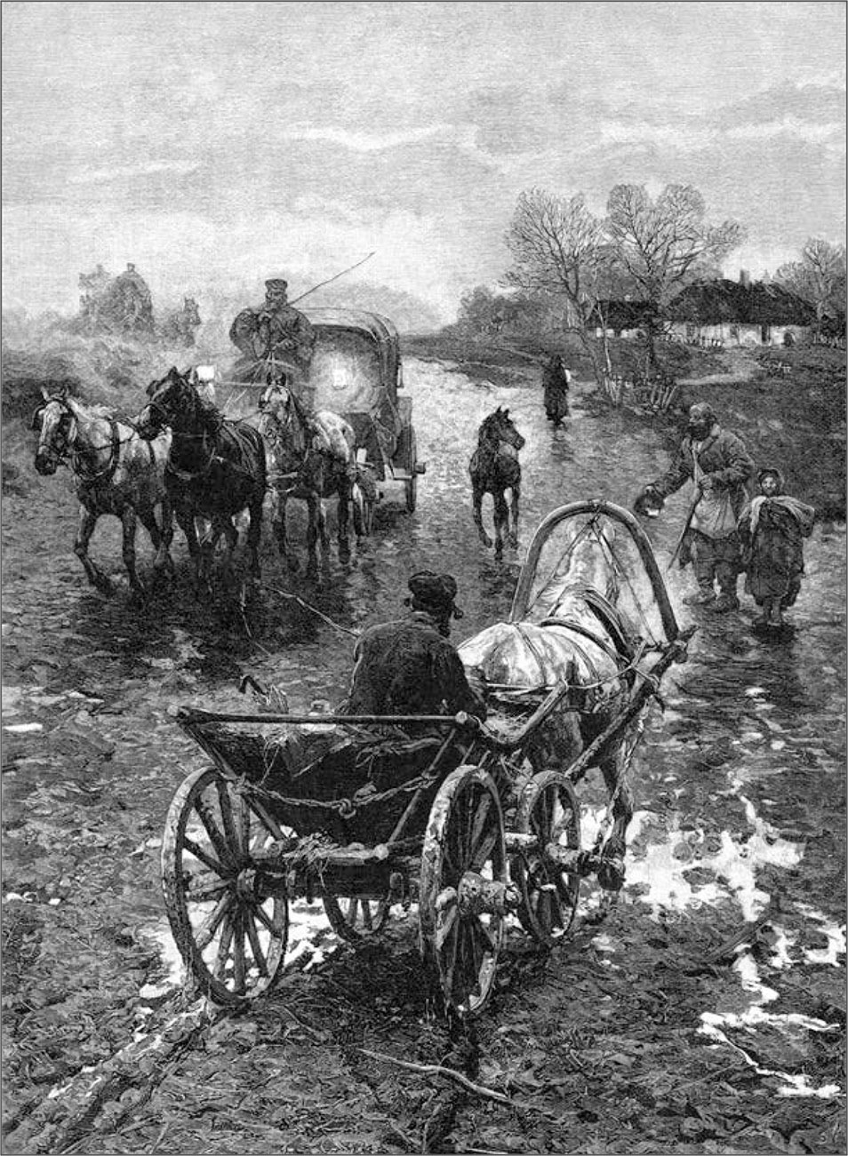 По правой стороне дороги на всем ее протяжении стояли телеграфные столбы с двумя проволоками. Становясь все меньше и меньше, они около деревни исчезали за избами и зеленью, а потом опять показывались в лиловой дали в виде очень маленьких, тоненьких палочек, похожих на карандаши, воткнутые в землю. На проволоках сидели ястребы, кобчики и вороны и равнодушно глядели на двигавшийся обоз.