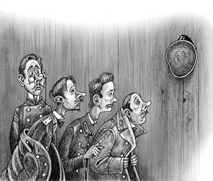 – А это что такое? – спросил один из компании, указывая на стену. На стене торчал большой гвоздь, а на гвозде висела новая фуражка с сияющим козырьком и кокардой. Чиновники поглядели друг на друга и побледнели.