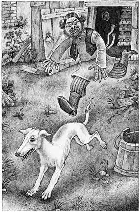 Слышен собачий визг. Очумелов глядит в сторону и видит: из дровяного склада купца Пичугина, прыгая на трех ногах и оглядываясь, бежит собака. За ней гонится человек в ситцевой крахмальной рубахе и расстегнутой жилетке. Он бежит за ней и, подавшись туловищем вперед, падает на землю и хватает собаку за задние лапы. Слышен вторично собачий визг и крик: «Не пущай!» Из лавок высовываются сонные физиономии, и скоро около дровяного склада, словно из земли выросши, собирается толпа.