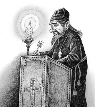 Дьячок хмурится и, подумав, медленно зачеркивает на заупокойном листе Авдотью. Перо на букве «д» взвизгивает и дает большую кляксу. Дьячок конфузится и чешет затылок.