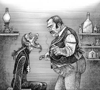 Придя в себя, дьячок сует в рот пальцы и на месте больного зуба находит два торчащих выступа.