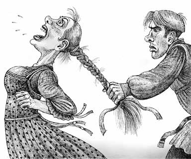 Девка взяла своего жениха за волосы.