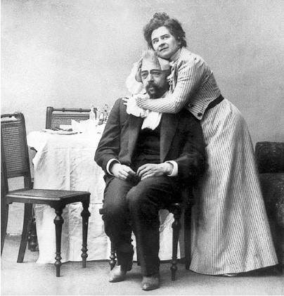 Сцена из спектакля «Чайка» в Московском Художественном театре. В роли Аркадиной – Ольга Книппер, в роли Тригорина – Константин Станиславский. 1899 год[14]14