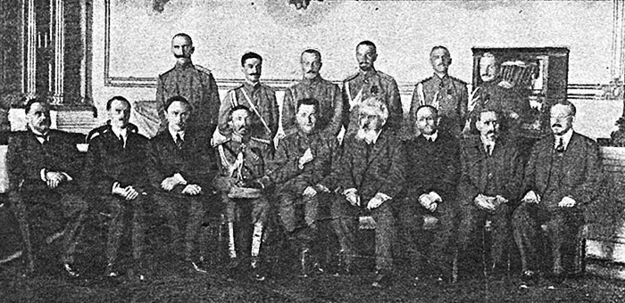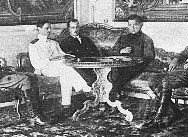 Члены Временного правительства с Верховным главнокомандующим накануне государственного совещания. В центре сидит А.Ф. Керенский, слева от него Л.Г. Корнилов, сзади стоит Б.В. Савинков. Август 1917 г.
