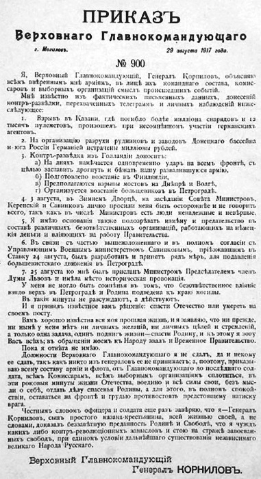 Приказ Верховного главнокомандующего генерала от инфантерии Л.Г. Корнилова с объяснением смысла происходящих событий («Корниловское выступление»). 29 августа 1917 г.