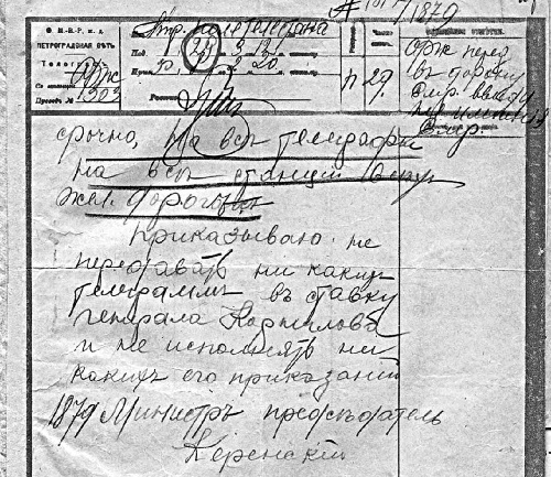 Телеграмма А.Ф. Керенского на все телеграфные станции о запрещении передавать телеграммы в ставку Л.Г. Корнилова.