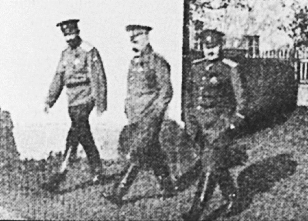 Быховские узники на прогулке. Слева направо – генерал-лейтенант С.Л. Марков, генерал-лейтенант А.И. Деникин, генерал-лейтенант И.П. Романовский. Октябрь – ноябрь 1917 г.