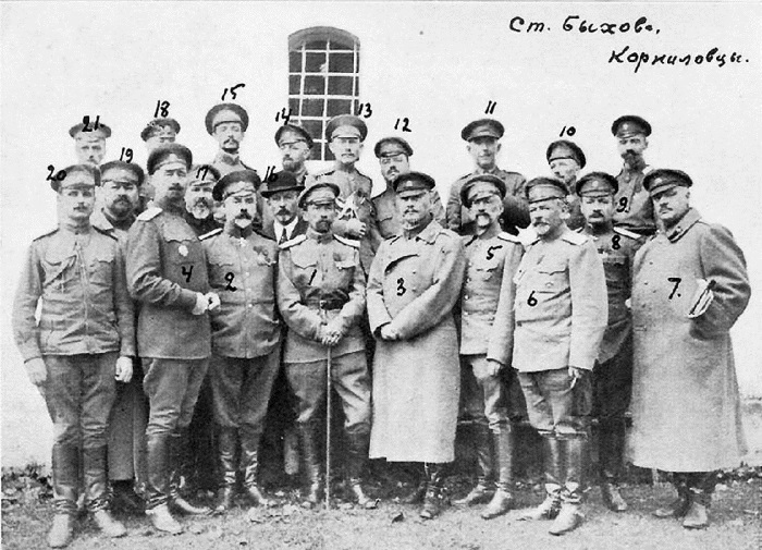 1. Л.Г. Корнилов. 2. А.И. Деникин. 3. Г.М. Ванновский. 4. И.Г. Эрдели. 5. Е.Ф. Эльснер. 6. А.С. Лукомский. 7. В.Н. Кисляков. 8. И.П. Романовский. 9. С.Л. Марков. 10. М.И. Орлов. 11. Л.Н. Новосильцев. 12. В.М. Пронин. 13. И.Г. Соотс. 14. С.Н. Ряснянский. 15. В.Е. Роженко. 16. А.П. Брагин. 17. И.А. Родионов. 18. Г.Л. Чунихин. 19. В.В. Клецанда. 20. Прапорщик С.Ф. Никитин. 21. Неизвестный
