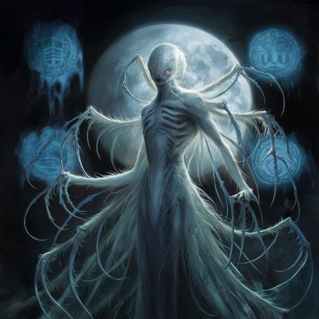 Пространство дрогнуло. Его прошила узкая и кривая прореха, оттуда показалась тонкая, словно опушённая белыми нитями лапка, за ней вторая, третья. Десятки белесых конечностей раздвинули щель, и в спальню протиснулось удивительное инфернальное существо, напоминающее одновременно гуманоида и паука.