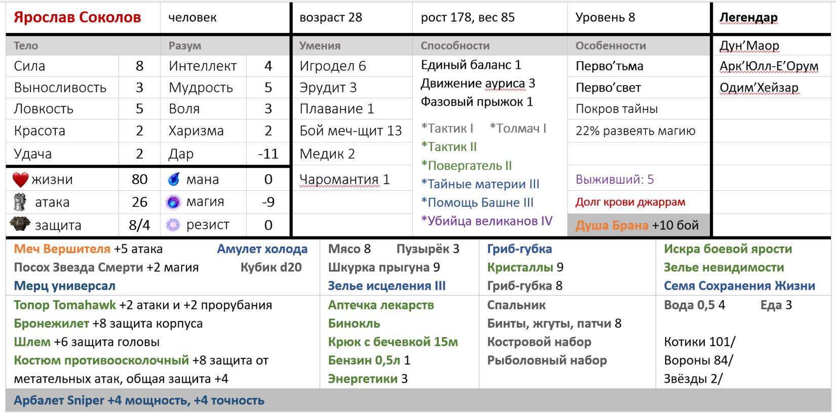 Получены уровни 7 и 8: +10 очков жизни, +2 свободных очка параметров и +2 к наиболее активно использованным классовым характеристикам: ловкость и сила. Получено свободное очко умений и свободное очко способностей.
