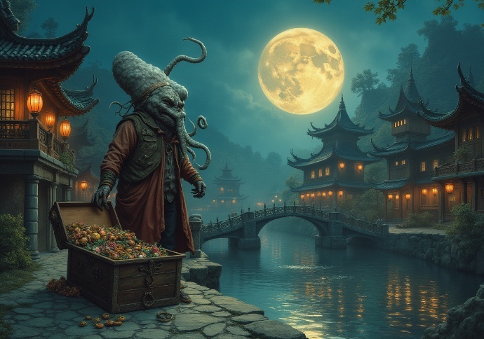 Это произнёс некто, стоящий у самой реки, необычным глухим и осклизлым голосом, как будто с забитым носом, полным неизбывного хлюпа. К нам обращался не такой уж и гуманоид, хоть и прямостоящий с двумя руками и ногами. Но его голова казалась огромной и возвышалась назад, как Пизанская башня под наклоном. Существо напоминало осьминога, приделанного к человеческому телу, и отчасти иллитида – тонкие щупальца-усы помогали ему перебирать товары в крупном сундуке, который стоял распахнутый у его ног.