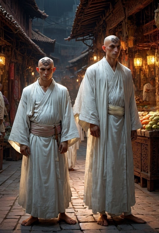 А, конечно. После взрыва, разнёсшего окна на пару кварталов вокруг, должны были явиться стражи порядка. Перед ломбардом и зелёной лавкой стояли двое босых монахов в белых робах с замысловатыми татуировками на лбах. Хм, у них на лицах пропечатан орнамент в виде хохочущей морды Обу-Хурая? А у владыки неплохо с юмором и самокритикой.