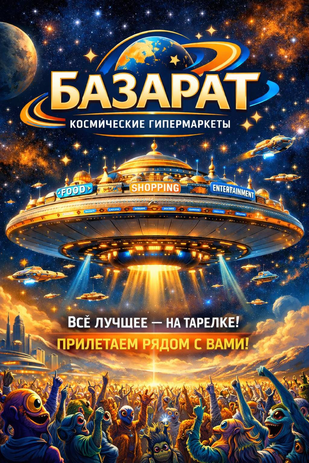 «Базарат» был типичной летающей тарелкой, только пять километров в диаметре и полной товарами до краёв. Гипермаркеты этой сети кочевали по звёздным системам, и каждый прилёт становился праздником, привлекая толпы покупателей и туристов. Ведь для любых планетников выгодно получить тур выходного дня в идеальный развлекательный центр с топовым шоппингом, не покидая родной системы. Можно сказать, им приносили все эти радости на тарелочке с голубой каёмочкой: не зря фирменные цвета «Базарата» были золотой, оранжевый и голубой.