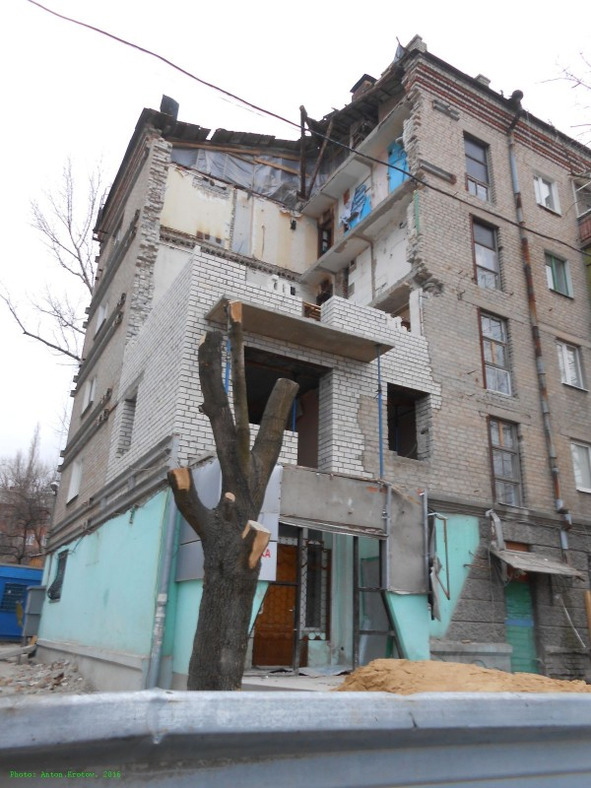 На фото: дом в Луганске, 2016. За пару лет до этого снимка люди тоже покупали квартиры в Луганске за большие деньги. Теперь некоторых из этих квартир нет вовсе, а остальные можно продать-купить за 25% стоимости.