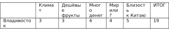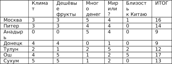 Близость к Китаю я взял как пример для человека, которому приятно и интересно ездить в Китай. Делать это из Оша, например, довольно просто и быстро, а вот из Анадыря или Донецка совсем не так удобно. Кому-то будет важна близость к Европе, а другому – место жительства его родителей, друзей, какой-нибудь особо ценной женщины и проч. Итак, согласно таблице, для человека с таким набором важных параметров Ош окажется наиболее эффективным. Но когда ты, читатель, будешь составлять свою таблицу, не забудь там проставить и другие города, ведь выбор достаточно велик. Например, если добавить ещё одну строчку
