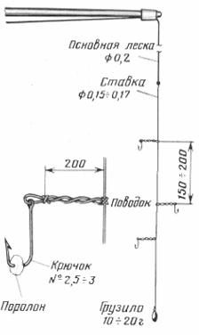 На катушку или мотовило наматывают необходимый запас лески диаметром 0,4 мм и привязывают к ней ставку (на Сахалине ее называют «гирляндой») из 0,20–0,25-миллиметровой лески длиной 2–2,5 метра с несколькими крючками № 5-№ 6. Некоторые рыболовы предпочитают привязывать крючки непосредственно к ставке, другие – на коротких поводках, на удалении 20–30 сантиметров один от другого.