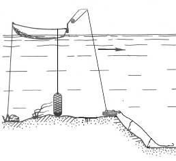 Это бревнышко привязывают тросом к достаточно тяжелому грузу, так, чтобы верхний конец торчал из воды на 40–50 см. К бую привязывают веревку с носа лодки, а с кормы бросают якорь и фиксируют лодку врастяжку, носом к ветру.