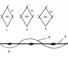 Рис. 24. Неравномерная посадка сети: 1 – зауженная ячейка (в верхней части сети); 2 – уширенная ячейка (в нижней части сети); 3 – симметричная ячейка (в средней части сети); 4 – положение нижней (А) и верхней (Б) подбор относительно друг друга (вид сверху).