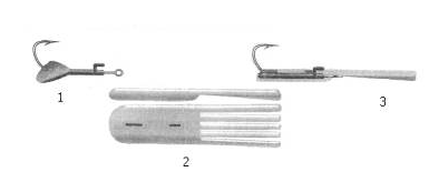 Рис. 33. «Летающая рыбка»: 1 – свинцовое грузило с крючком; 2 – силиконовая приманка; 3 – «летающая рыбка» в сборе.