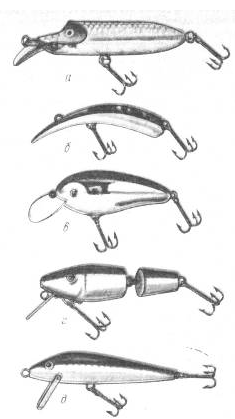 Рис. 35. Воблеры: а – с регулируемой лопастью; б – бананообразный; в – шумящий (с внутренней полостью и шариками в ней); г – двухсоставной; д – классический «Рапала».