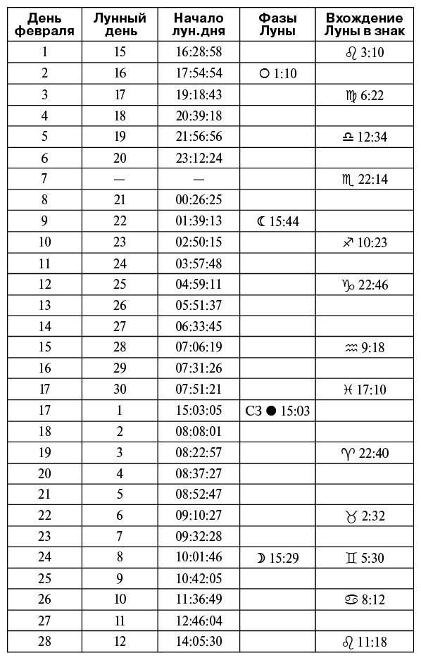 15 (с 9:18), 16, 17 (до 17:10) февраля Луна в знаке Водолея. Ничего не сеять и не сажать! 17 февраля (15:03) – Новолуние, Солнечное затмение.