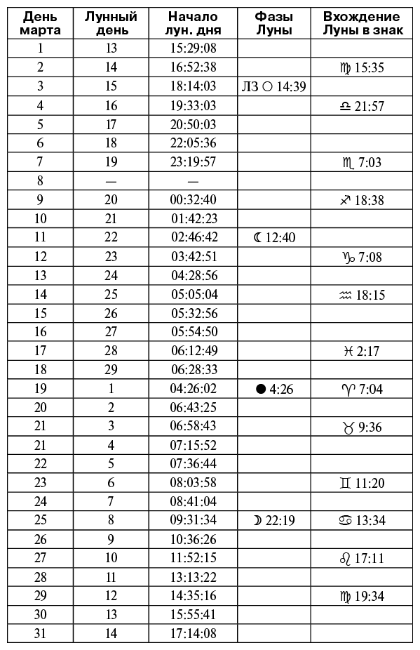 2 (с 15:35), 3, 4 (до 21:57) марта Луна в знаке Девы. 3 марта (14:39) – Полнолуние, Лунное затмение. Благоприятное время для посадки и пересадки комнатных растений. Хорошие дни для посадки и посева на рассаду овощных культур и особенно цветов.