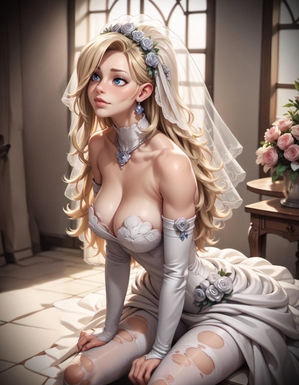Затрещала ткань, обнажая роскошную грудь блондинки с торчащими коричневыми сосками, на пол посыпались бусинки, цветочки и ещё какая-то требуха, невеста ойкнула и стыдливо прикрыла грудь руками, аллея на глазах.