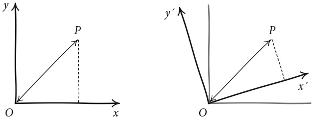Если мы повернем оси вокруг начала координат O, как показано на правом рисунке, и определим новый набор координат (x', y'), расстояние от начала координат, очевидно, останется неизменным и теорема Пифагора будет работать так же, как и раньше: