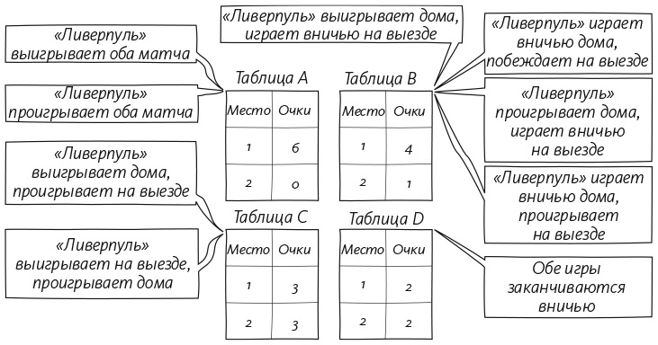 Математика Премьер-лиги с двадцатью командами слишком сложна, чтобы разобраться в ней во всех подробностях, поэтому сократим число команд и представим урезанную лигу, в которой всего два соперника: «Ливерпуль» и «Манчестер Юнайтед». Ради математической простоты мы уберем все остальные команды, включая «Эвертон», «Арсенал», «Тоттенхэм Хотспур» и даже живущий на нефтяные деньги «Манчестер Сити». В сезоне такой ужатой Премьер-лиги состоятся всего две игры, а значит, возможны всего девять разных исходов. Если нас не беспокоит вопрос, кто на первом месте, а кто на втором, разные результаты матчей могут привести к одинаковой турнирной таблице. Поскольку за победу начисляется три очка, за ничью – одно, а за поражение – ноль, девять возможных исходов дадут четыре разные турнирные таблицы, как показано на следующем рисунке.