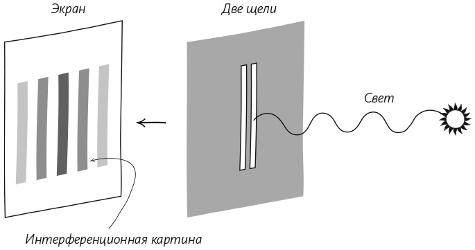 Юнг установил волновую природу света в классическом эксперименте. Он взял темный экран и прорезал в нем две щели очень близко друг к другу, а за ним поставил второй экран. Когда ученый направил луч света на первый экран, он обнаружил изображение на втором. Если свет – поток частиц, то на экране должна появиться непрерывная полоса света с максимальной интенсивностью посередине, непосредственно за двумя щелями. Здесь вы можете провести аналогию с градом пуль, выпущенных без разбора в сторону экрана. Проходя через узкие промежутки, они будут отклоняться и чаще попадать в середину экрана, чем в его края. Стоять в центре хуже всего, поскольку пули попадают с обоих направлений, – в отличие, скажем, от правого края, где вам будут угрожать только пули, прошедшие через правую щель. Однако в своем эксперименте Юнг не обнаружил такой «пулевой» картинки. Он увидел ряд светлых и темных полос, которые напоминали штрихкод на товарах из супермаркета.