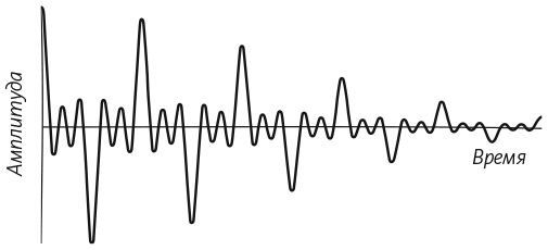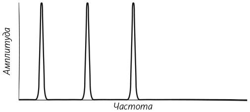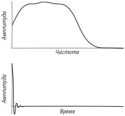 Поскольку Фил – любитель металла, он также любит прием, когда металлист при игре прижимает ребром ладони струны гитары в районе бриджа (струнодержателя), чтобы приглушить звук. В результате получается классическое звучание хеви-метала – нота та же, только теперь она отличается характерной глухостью. Если вы проанализируете спектр такого приглушенного звучания, то обнаружите те же гармоники, что и без него (в конце концов, нота осталась той же), но пики сливаются друг с другом, образуя аморфное пятно неопределенной частоты.