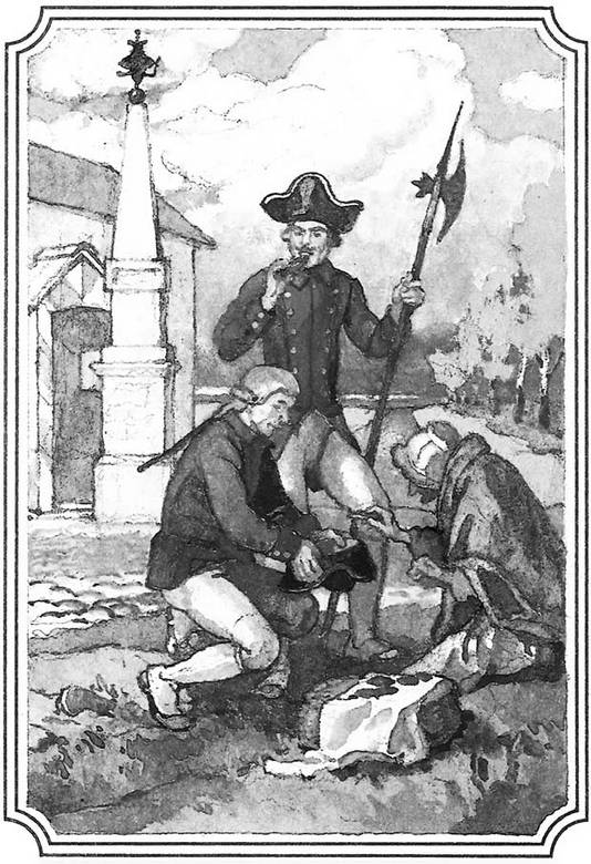 На другое утро, когда еще Ивановна покоилась в объятиях глубокого сна, Онуфрич тихонько поднялся с постели, смиренно помолился иконе Николая Чудотворца*, вытер суконкою блистающего на картузе орла* и почталионский свой знак и надел мундир. Потом, подкрепив сердце большою рюмкою ерофеича*, вышел в сени. Там прицепил он тяжелую саблю свою, еще раз перекрестился и отправился к Проломной заставе.