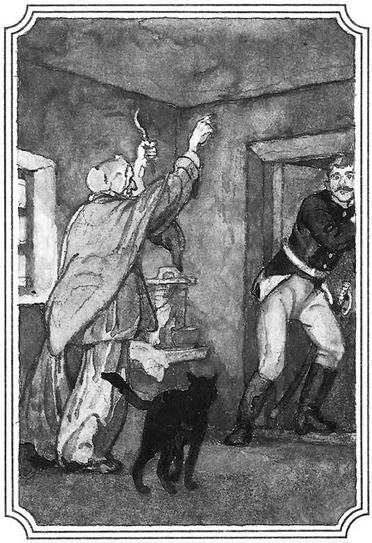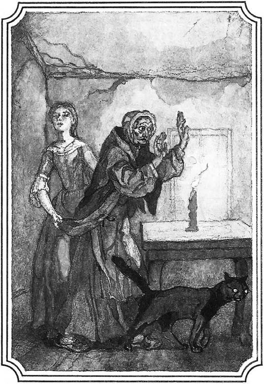 Старуха начала ходить кругом стола и протяжным напевом произносила непонятные слова; перед нею плавно выступал черный кот с сверкающими глазами и с поднятым вверх хвостом. Маша крепко зажмурилась и трепещущими шагами шла за бабушкой. Трижды три раза старуха обошла вокруг стола, продолжая таинственный напев свой, сопровождаемый мурлыканьем кота. Вдруг она остановилась и замолчала… Маша невольно раскрыла глаза – те же кровавые нити все еще растягивались по воздуху. Но, бросив нечаянно взгляд на черного кота, она увидела, что на нем зеленый мундирный сюртук, а на месте прежней котовой круглой головки показалось ей человеческое лицо, которое, вытараща глаза, устремляло взоры прямо на нее… Она громко закричала и без чувств упала на землю…