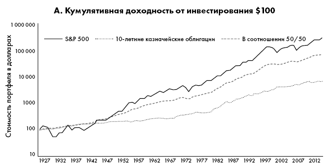 Рисунок 2.1. Доходность от инвестирования 100 долларов в биржевой фонд SPDR S&P 500 ETF Trust [SPY] (отслеживает цены акций 500 крупнейших компаний США из рейтинга S&P 500) в сравнении с доходностью от инвестирования 100 долларов на рынке облигаций казначейства США и в портфель ценных бумаг, поровну состоящий из акций и облигаций. Как видно из рисунка, добавление акций в инвестиционный портфель может кратно увеличить доходность по сравнению с традиционно более безопасными инвестициями.