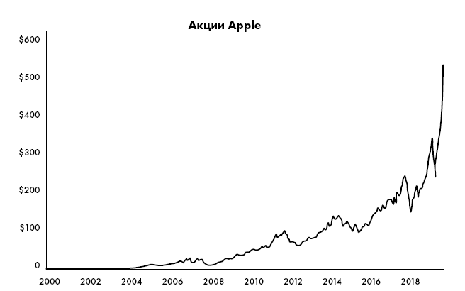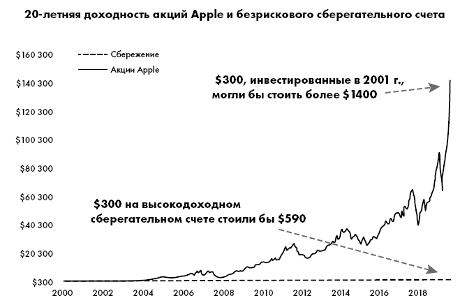Рисунок 2.2. 300 долларов, которые можно было вложить в акции Apple Inc. [APPL] в начале 2001 г., принесли бы более 140 000 долларов к апрелю 2020 г. И это несмотря на 3 крупных обвала рынка: крах пузыря доткомов в 2001 г., финансовый кризис 2008 г. и пандемия 2020 г. Для сравнения, 300 долларов, отложенные на высокодоходный сберегательный счет, к тому же времени оказались бы лишь 590 долларами.