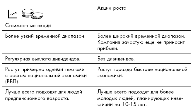 В книге я использую аналогичную модель и разделяю акции на две главных категории: акции роста (или быстрорастущие акции) и стоимостные (недооцененные) акции. Выбор в пользу одной из двух категорий зависит от уровня риска, который вы считаете допустимым.