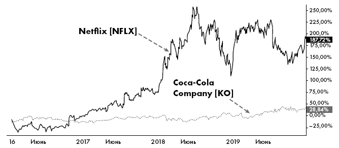 Рисунок 2.4. Показатели акций Netflix, Inc. [NFLX] (акции роста) в сравнении с акциями The Coca-Cola Company [KO] (стоимостные) за период с 2016 по 2019 годы. Coca-Cola выплачивает дивиденды и предлагает инвесторам стабильный денежный доход, но Netflix опережает ее по приросту капитализации.