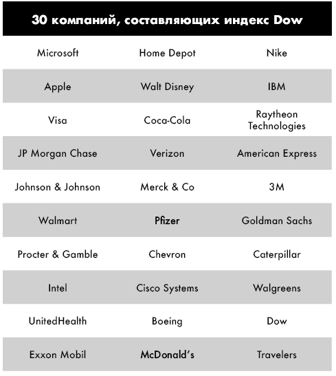 К примеру, упомянутый ранее индекс S&P 500 отражает стоимость акций 500 крупнейших компаний США. Еще один пример – индекс Dow Jones Industrial Average (DJIA), или просто Dow. Этот индекс фондового рынка измеряет динамику акций 30 крупных компаний, котирующихся на фондовых биржах США. Dow начал публиковаться с 1896 года и первоначально предназначался для отслеживания состояния американской тяжелой промышленности. Сейчас слово industrial («промышленный») в его названии – скорее дань истории, так как многие из его современных 30 составляющих почти или совсем не относятся к тяжелой промышленности.