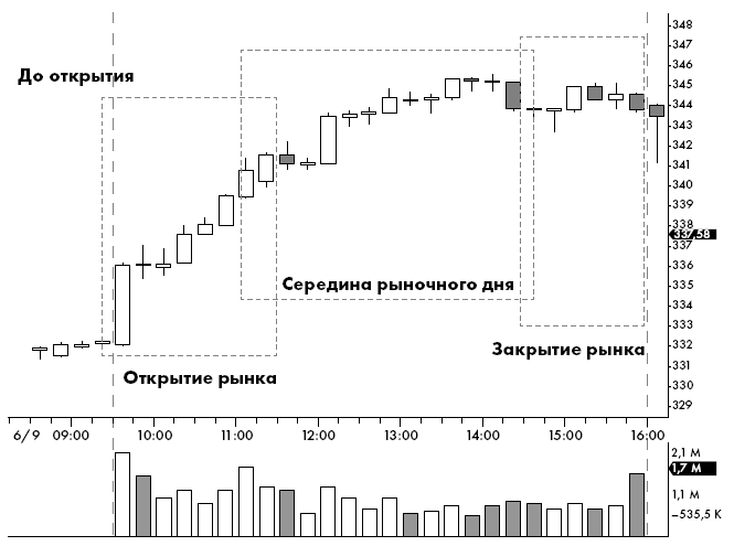 К примеру, если сегодня вы купите акции Apple Inc. [AAPL], вы не сохраните позицию на ночь, чтобы продать их завтра. Если оставляете позиции на ночь, это уже не дейтрейдинг, а свинг-трейдинг. На рисунке 2.6 приведен пример одного дня из жизни акций Apple. Посмотрите, как меняется объем торгов акциями, их цена и волатильность в течение торгового дня.