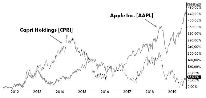 На рисунке 2.7 сравнивается цена акций Apple Inc. [AAPL] и Capri Holdings Limited [CPRI] (материнской компании Michael Kors, Versace и Jimmy Choo) за период с 2012 по 2019 год. Как видите, у одной компании траектория восходящая, а у другой – не слишком. Хотя иногда для недооцененных акций открываются отличные инвестиционные возможности. Нужно внимательно следить, какой тренд демонстрирует выбранная вами компания.