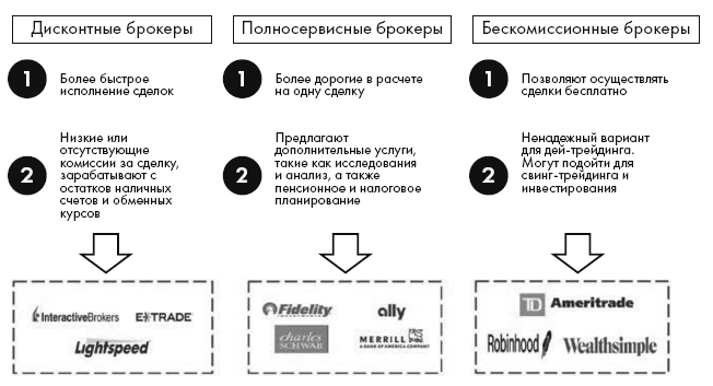 Существует три вида брокеров. Полносервисные брокеры подходят для инвесторов или свинг-трейдеров, а дисконтные брокеры – для активных трейдеров (их также часто называют брокерами прямого доступа). Завоевывает популярность и еще одна разновидность – бескомиссионные брокеры. Первопроходцем здесь стала компания Robinhood Markets, Inc., основанная в 2013 году. Как следует из названия, бескомиссионные брокеры позволяют трейдерам торговать «более или менее» бесплатно. Об этих трех видах брокеров я расскажу здесь, а затем в главах о дейтрейдинге Эндрю даст дополнительный комментарий о брокерах и их услугах.