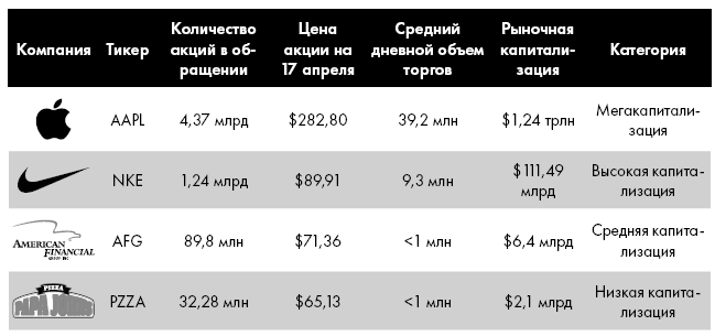 Рисунок 3.3. Рыночная капитализация, объем торгов и другие финансовые показатели четырех разных компаний на апрель 2020 года. Из рисунка видно, что компании с большей рыночной капитализацией имеют и более высокие ежедневные объемы торгов.