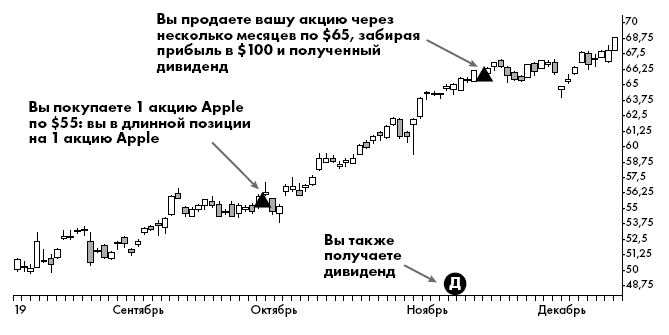Но что, если цены падают? В этом случае можно совершить «короткую продажу» и снова оказаться в прибыли. Как я уже отмечал, трейдеры могут занимать акции у брокера и продавать их, надеясь, что цена снизится, и затем они смогут выкупить эти акции по более низкой цене и получить прибыль. Это называется «короткая продажа» или просто «шорт». Когда говорят: «Я занял короткую позицию по Apple», это означает, что человек продал взятые взаймы акции Apple и надеется, что цена акций этой компании упадет.