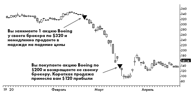 Представим, что во время снижения цены вы заняли у своего брокера 100 акций Apple. Соответственно, вы должны ему 100 акций (возможно, на вашем счете это отображается как «–100 акций»). Значит, вы должны вернуть брокеру 100 акций Apple. Ему не нужны деньги – он хочет вернуть свои акции. Таким образом, если цена снизилась, вы можете купить акции дешевле, чем ранее продали, вернуть их брокеру и оставить прибыль себе.