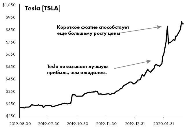 Рисунок 3.6. График, показывающий рост цены акций Tesla, Inc. (тикер: TSLA) в связи с отличным отчетом о прибылях. По мере роста цены акций трейдеры, занявшие короткие позиции, запаниковали и бросились возвращать брокерам одолженные у них акции. Их покупки акций Tesla для покрытия своих шортов привели к еще большему росту цены. Это называется «шорт-сквиз».