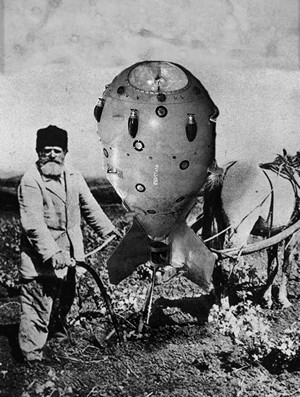 Фраза впервые появилась в некрологе, посвященном Сталину, в 1953 году в газете «The Times». Затем в 1956 году впервые была использована в статье о Сталине в Британской Энциклопедии: «He had found Russia working with wooden ploughs and is leaving her equipped with atomic piles». Encyclopaedia Britannica. – London, 1965. – Vol. 21. – P. 303.