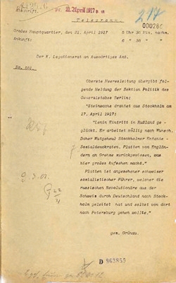«Въезд Ленина в Россию оказался успешным. Он работает в точности так, как мы того хотим. Отсюда крики ярости социал-демократов Антанты в Стокгольме. Платтена вернули назад англичане, обнаружив его у границы, и этот факт вызвал здесь много шуму».