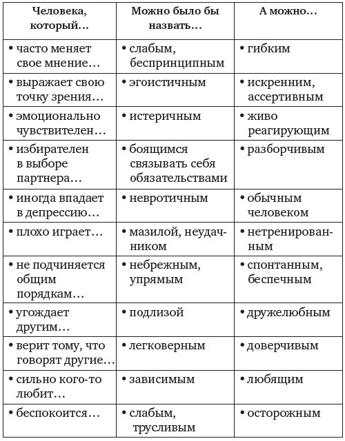 Рефрейминг (англ. reframe – вставить картину в новую раму) – прием, позволяющий изменить свою точку зрения, взглянуть на ситуацию с неожиданной стороны. Переформулируй неудачу в удачу: «Это не глупость, это – опыт нестандартных решений». Найди в неприятной ситуации положительные моменты, используя союз «зато»: «Пришлось извиниться, зато мы помирились». Поставь проблему в выгодный ряд сравнений: «На Машу вообще никто внимания не обращает». Снизь значимость ситуации во времени: «Через пять лет ты будешь смеяться над этим». Снизь значимость критика: «Успокойся, она ведь просто не смогла тебя понять». Совершенствуйся в искусстве позитивного рефрейминга. Потренируйся в смене ярлыков (по примеру таблицы).
